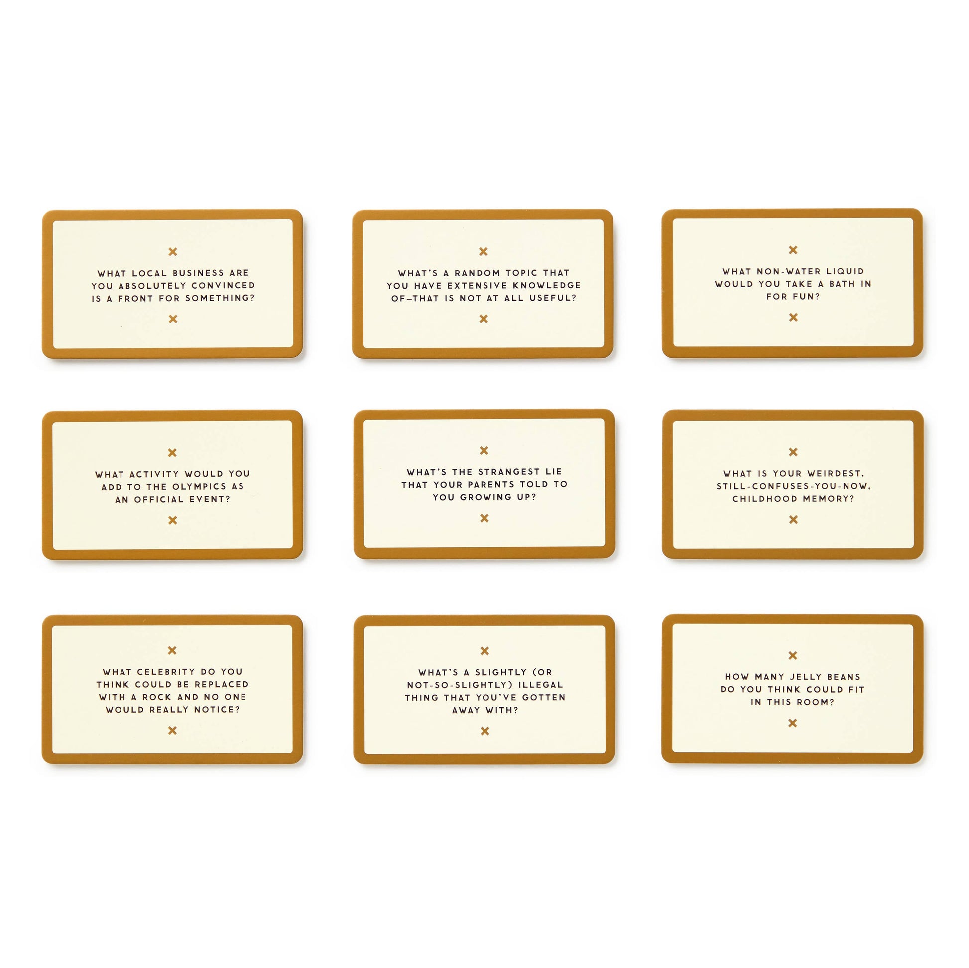 HOW TO PLAY - Includes 200 question cards and some rules to turn it all into a game (if you want to, that is). Topics like ‘What’s the pettiest reason you’ve ever broken up with someone?’ and ‘What’s a secret talent no one in the room knows you have?’