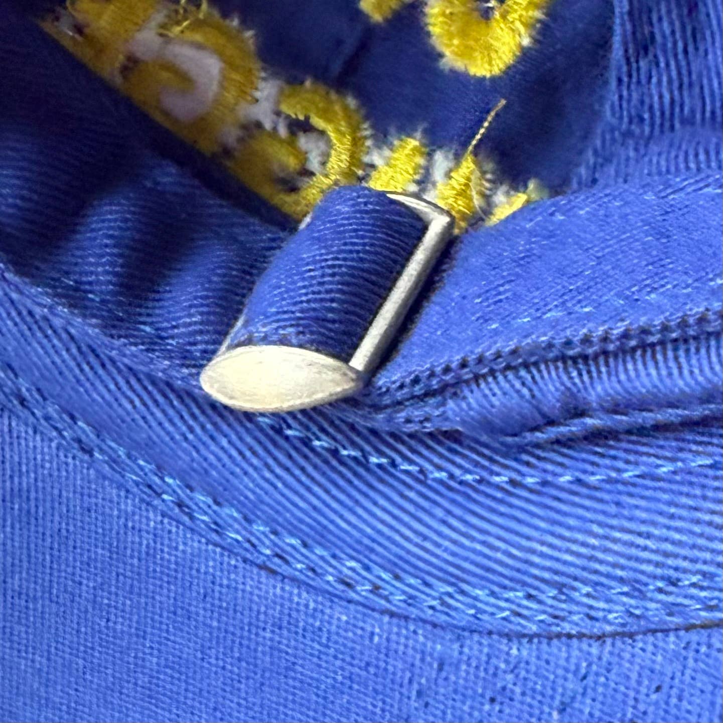-one size fits most hat in Royal blue with yellow embroidery -embroidered in the US, hat manufactured overseas -slide closure with metal slider