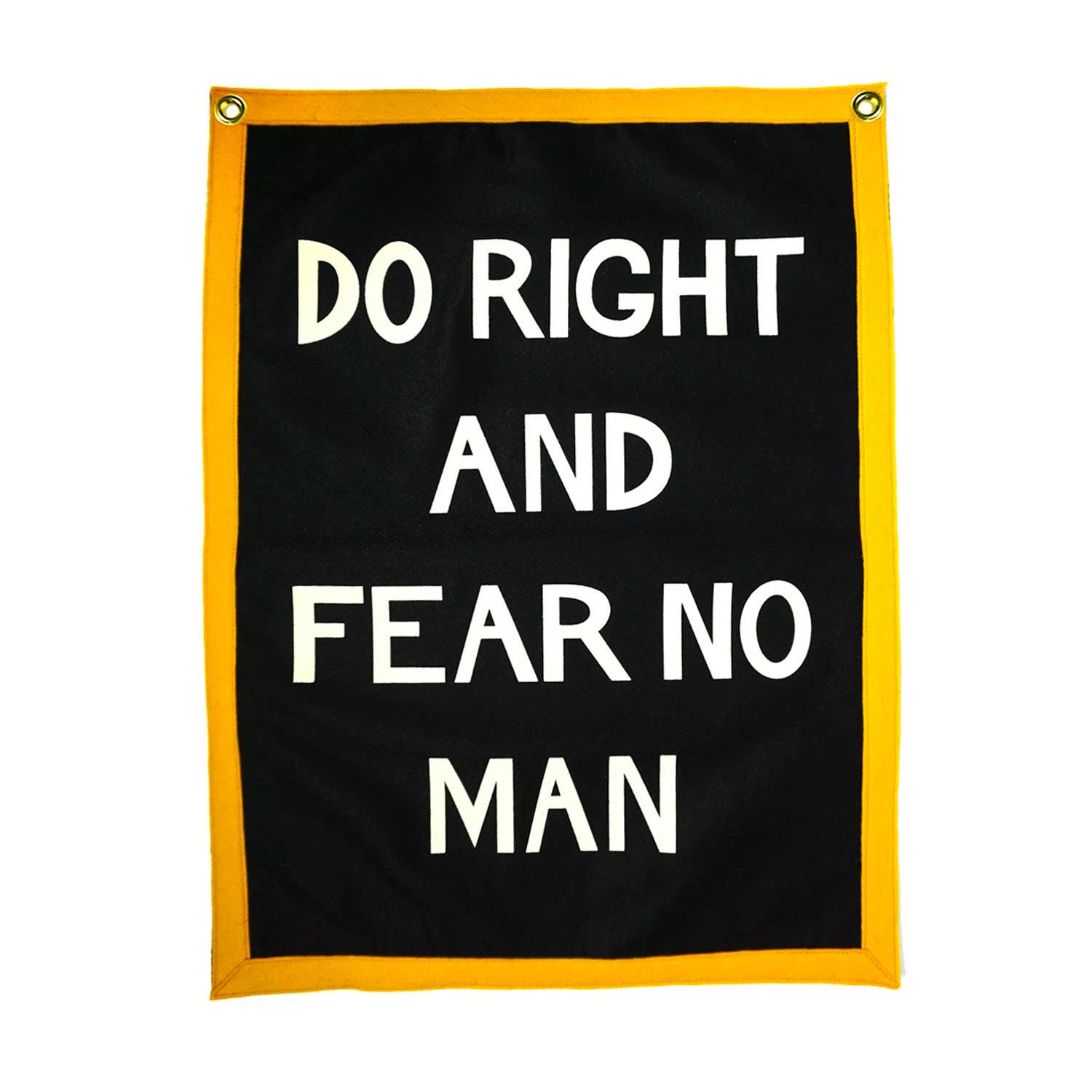 Inspired by our friends at Old Souls in Cold Spring, NY who found photograph of that phrase and passed it along for us to interpret. This design is also available as a pennant, stitched banner, and patch. Size: 18" x 24" Material: Cut-and-sewn wool felt and screen-printed design Color: Black body, Cream and Gold details