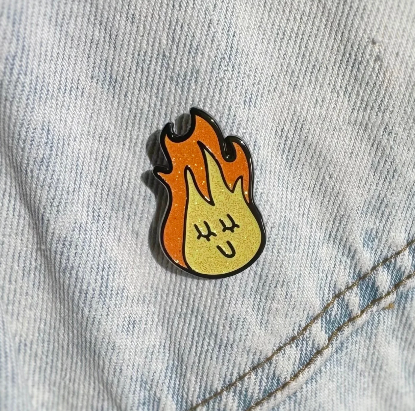 The cutest little happy flame! And he is glittery. This durable enamel pin measures 1.25β. Spice up your bag or denim jacket today!