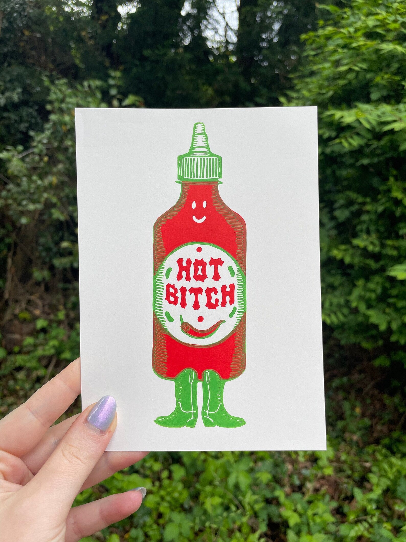 This is a 5x7 inch, two color print of a hot sauce bottle with a little smiley face that says "Hot Bitch" on the label!