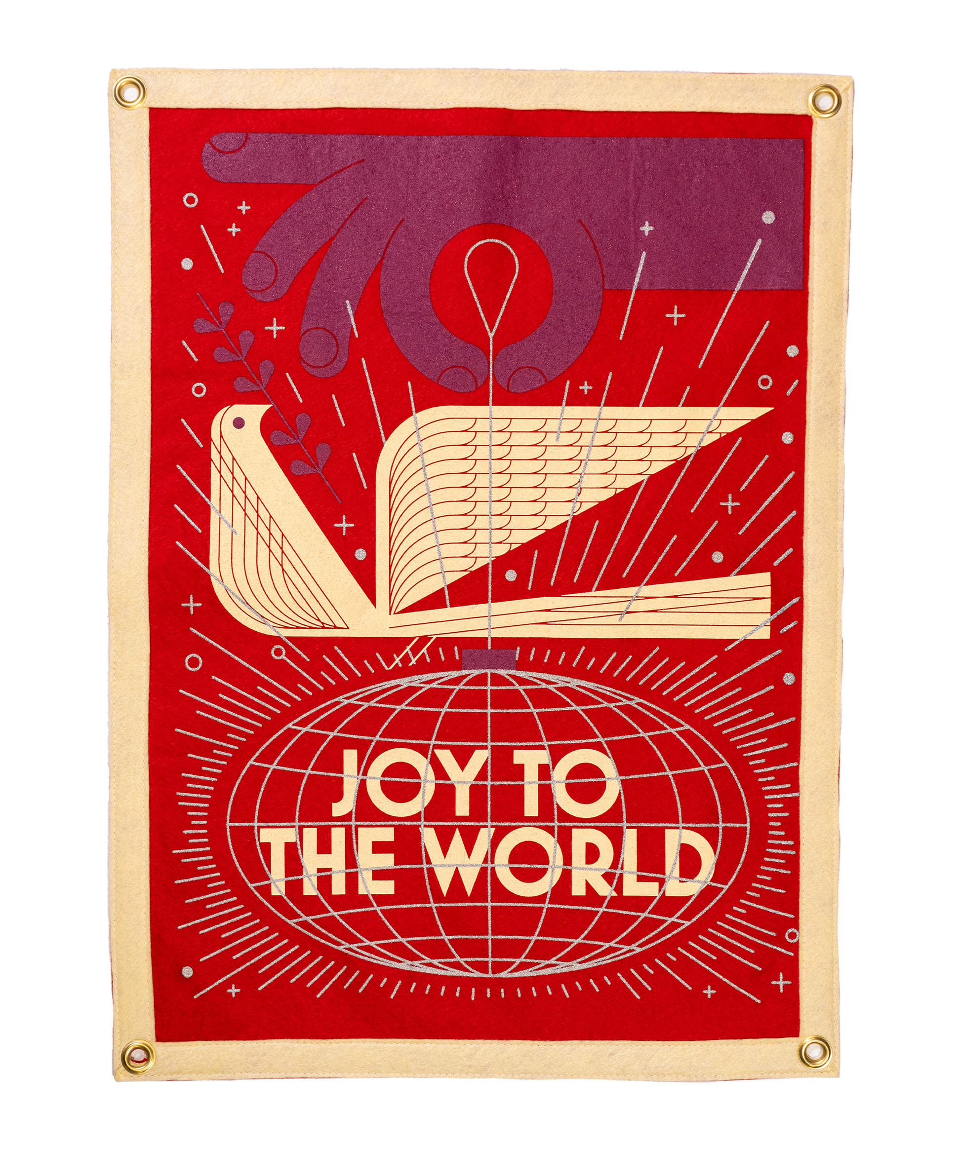 Spread joy throughout your home this holiday season with our 'Joy To The World' camp flag. Designed by our long time friends Invisible Creature. Size: 18" x 24" Color: Red body with cream, purple, and metallic silver details
