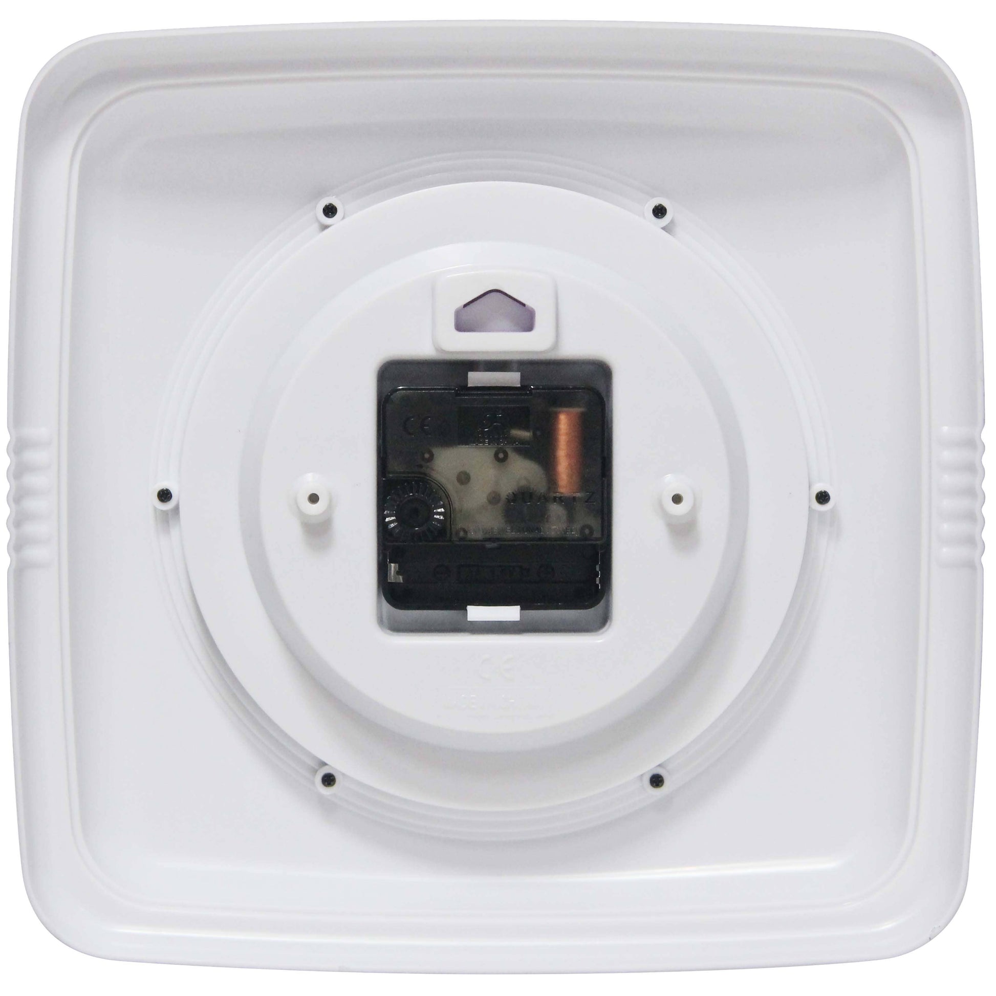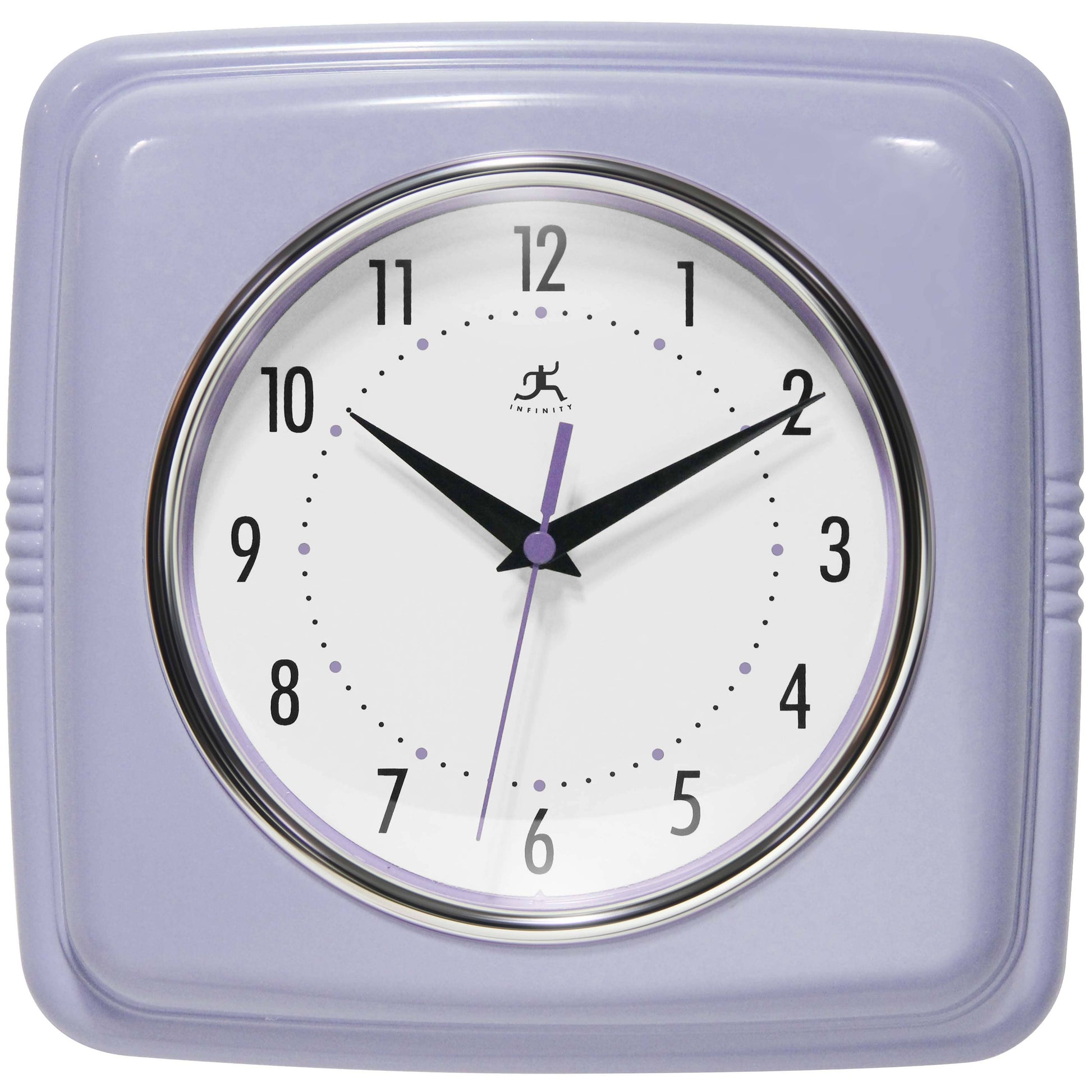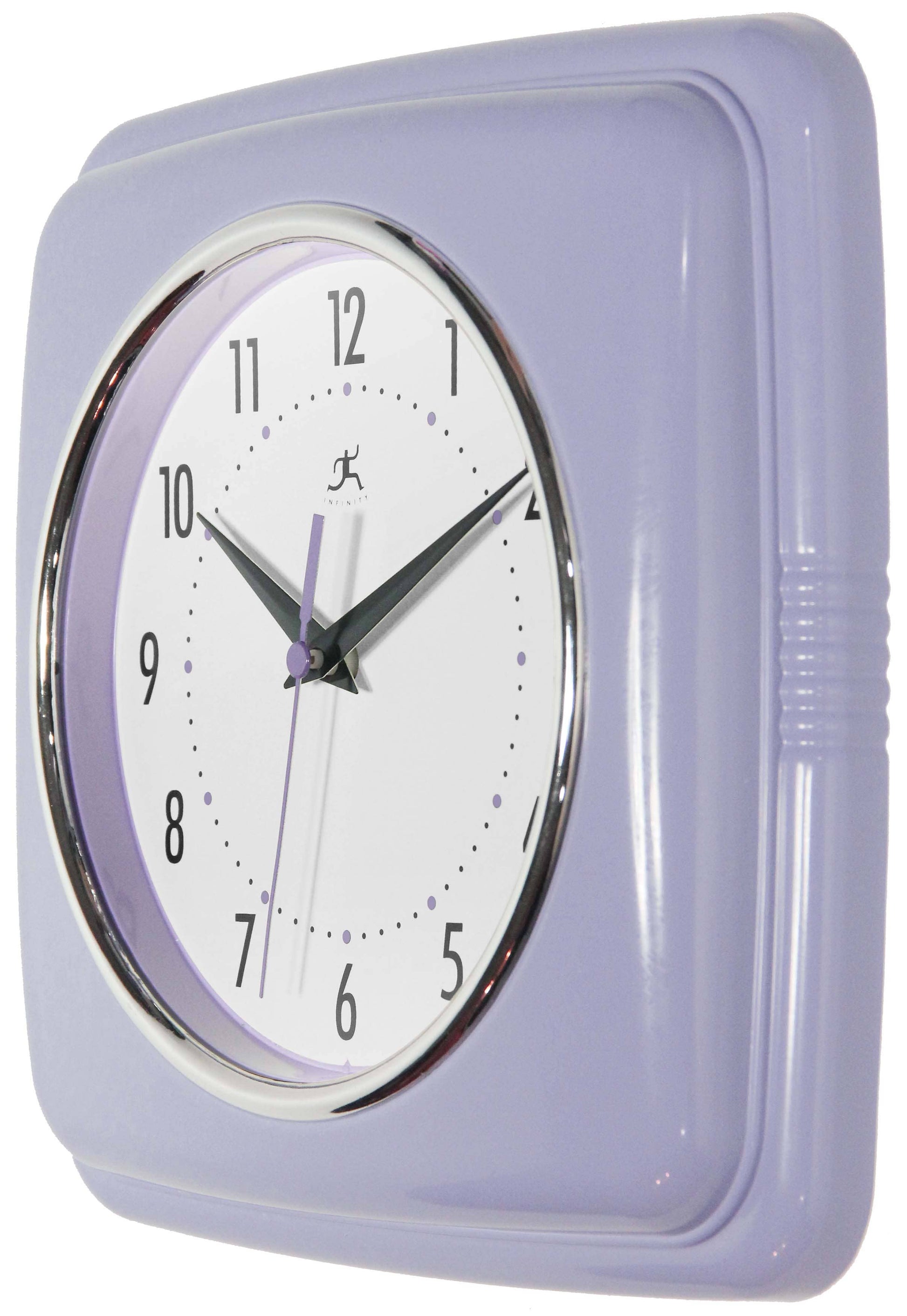 Infinity Instruments 9.25" Square Retro home essential wall clock can give your home that retro feel. With a square designed case this amazing clock will bring you back in time.9.25 in Square Wall Clock for Indoor Use. Quartz Movement for Accurate Time Keeping. Glass Cover over an Off-White Face and Metal Hands. Uses 1 AA Battery (Not Included). 9.25 in H x 9.5 in L x 1.875 in D.
