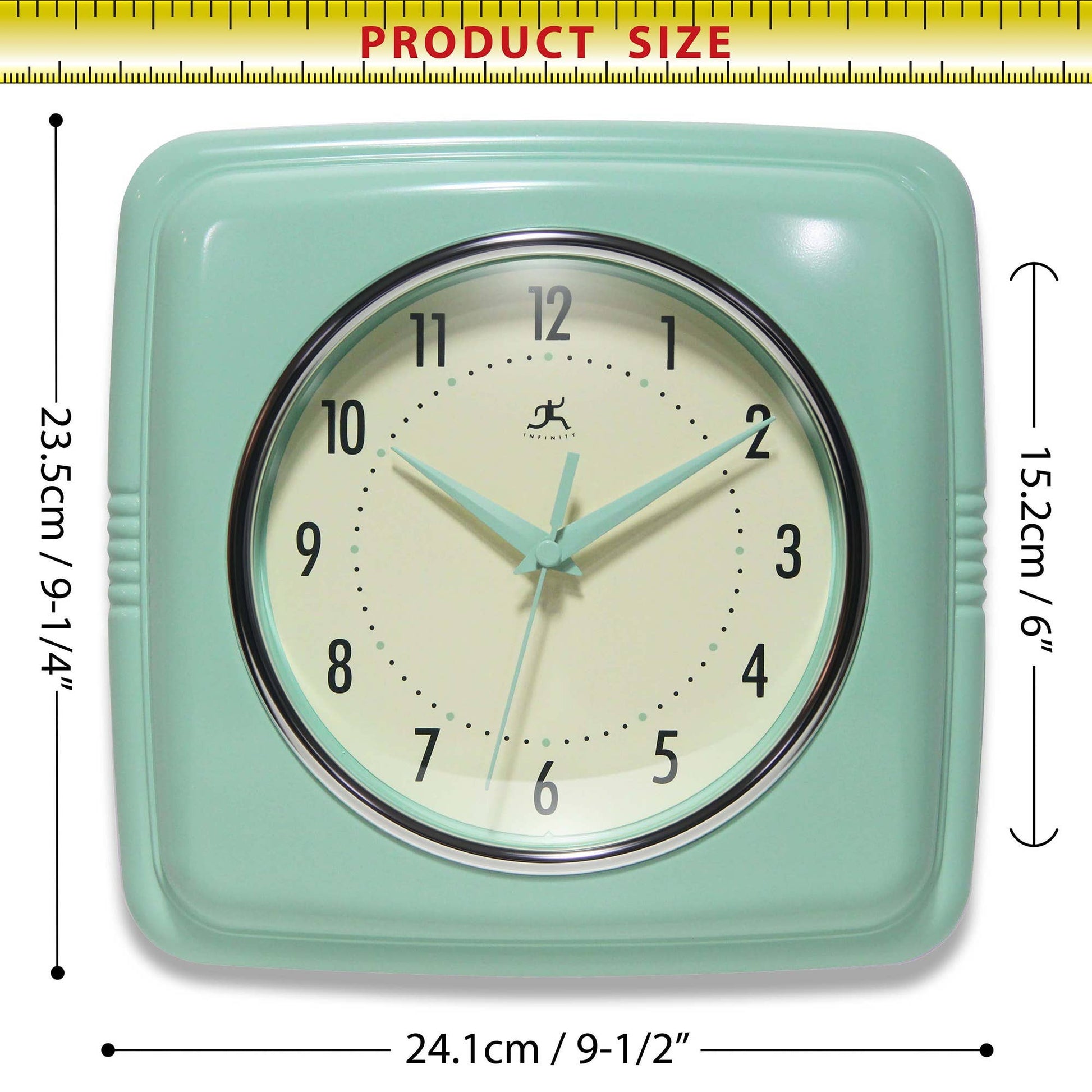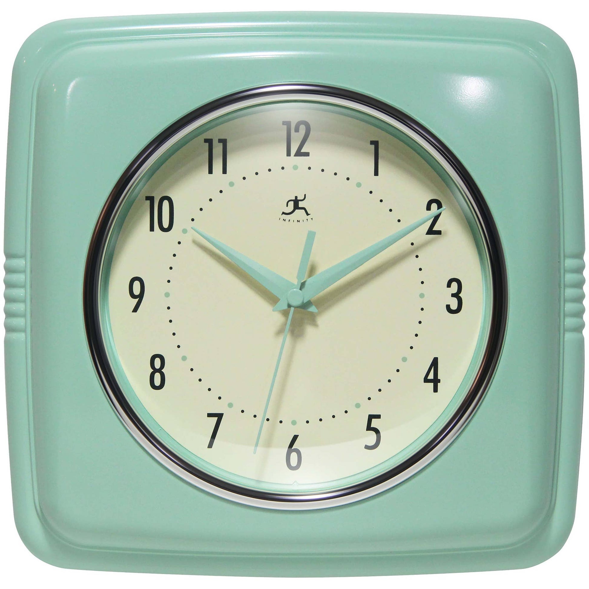 Infinity Instruments 9.25" Square Retro Pastel Green home essential wall clock can give your home that retro feel. With a square designed case this amazing clock will bring you back in time.