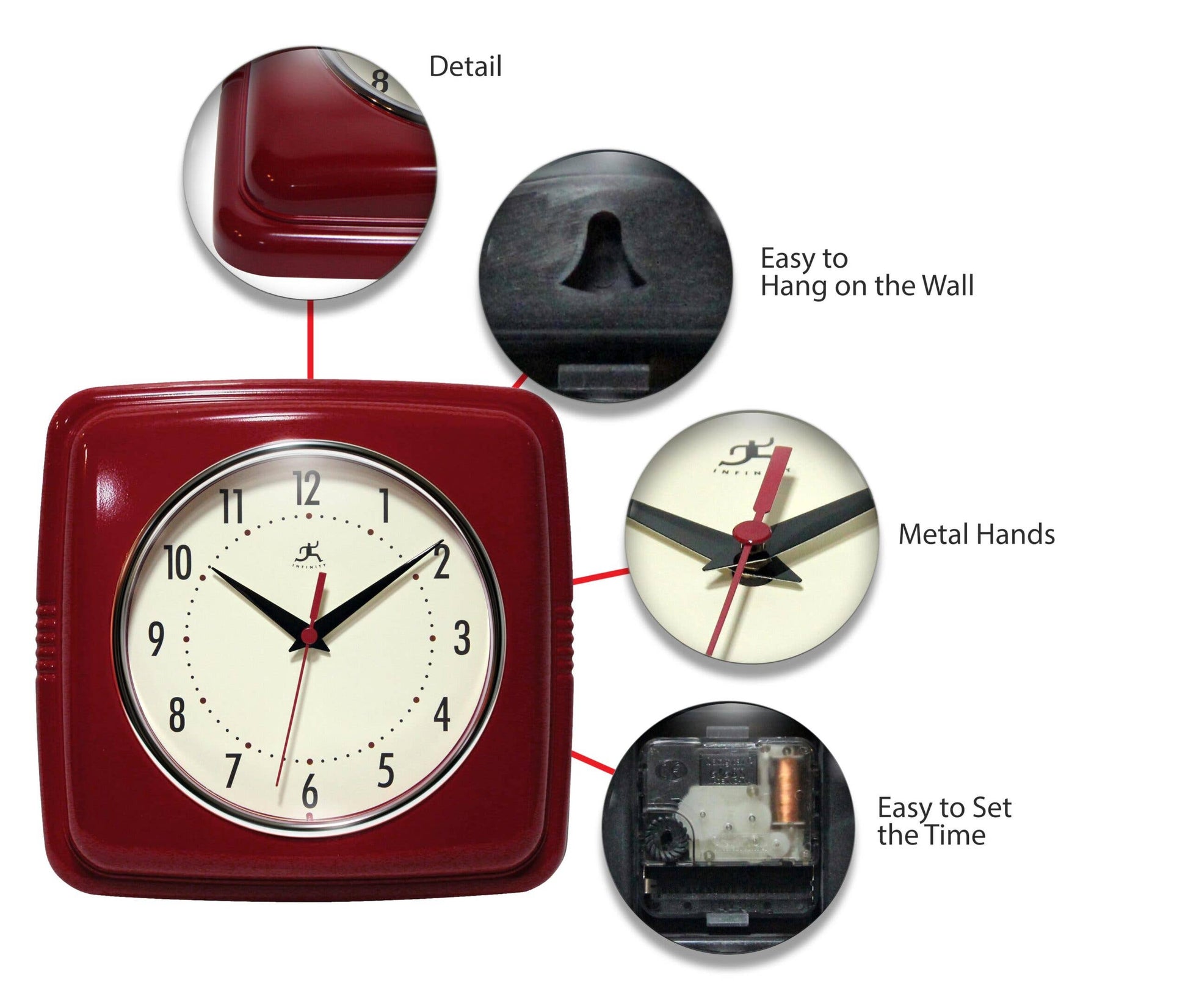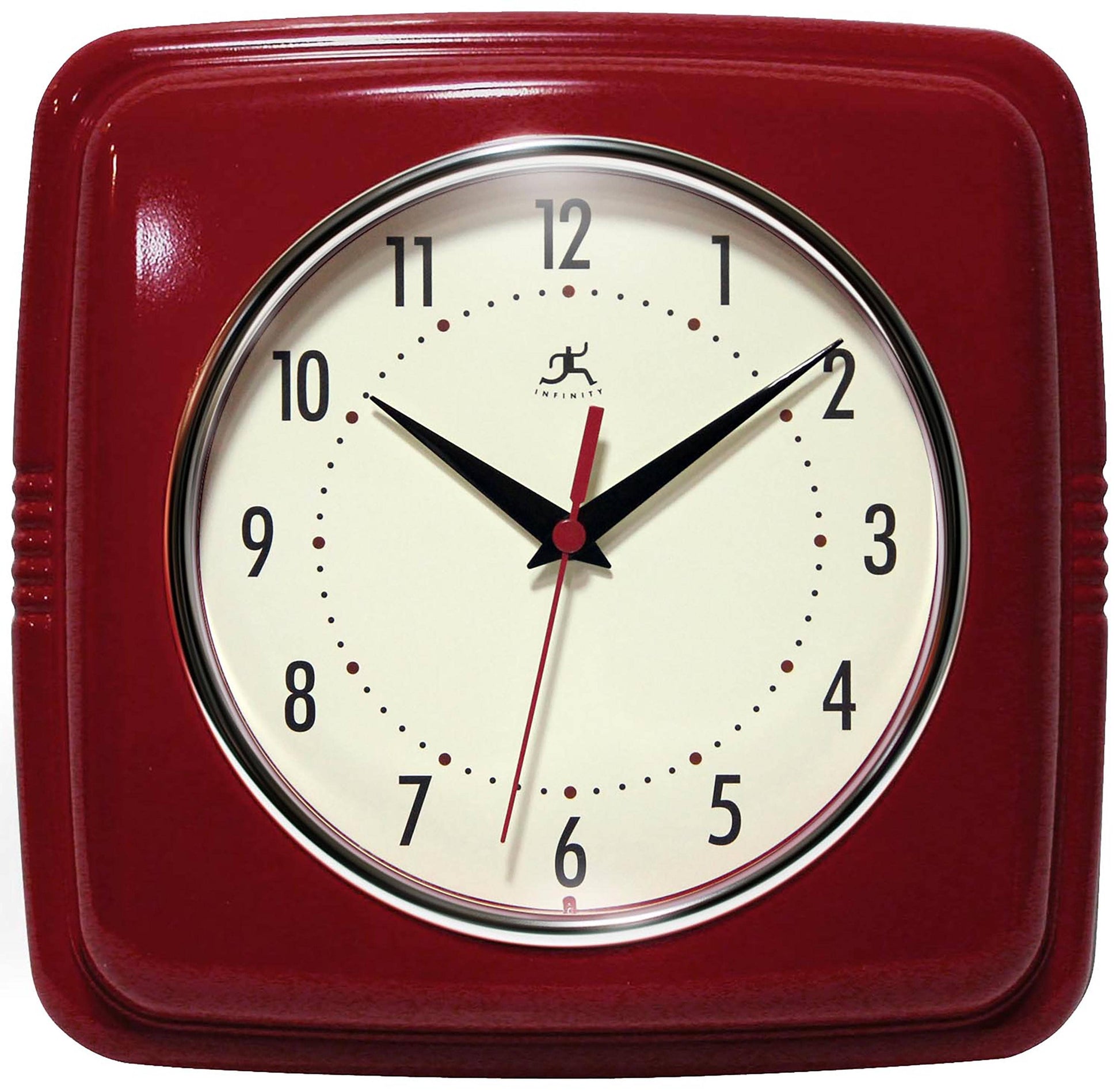 Infinity Instruments 9.25" Square Retro home essential wall clock can give your home that retro feel. With a square designed case this amazing clock will bring you back in time. Quartz Movement for Accurate Time Keeping. Glass Cover over an Off-White Face and Metal Hands. Uses 1 AA Battery (Not Included). 9.25 in H x 9.5 in L x 1.875 in D.