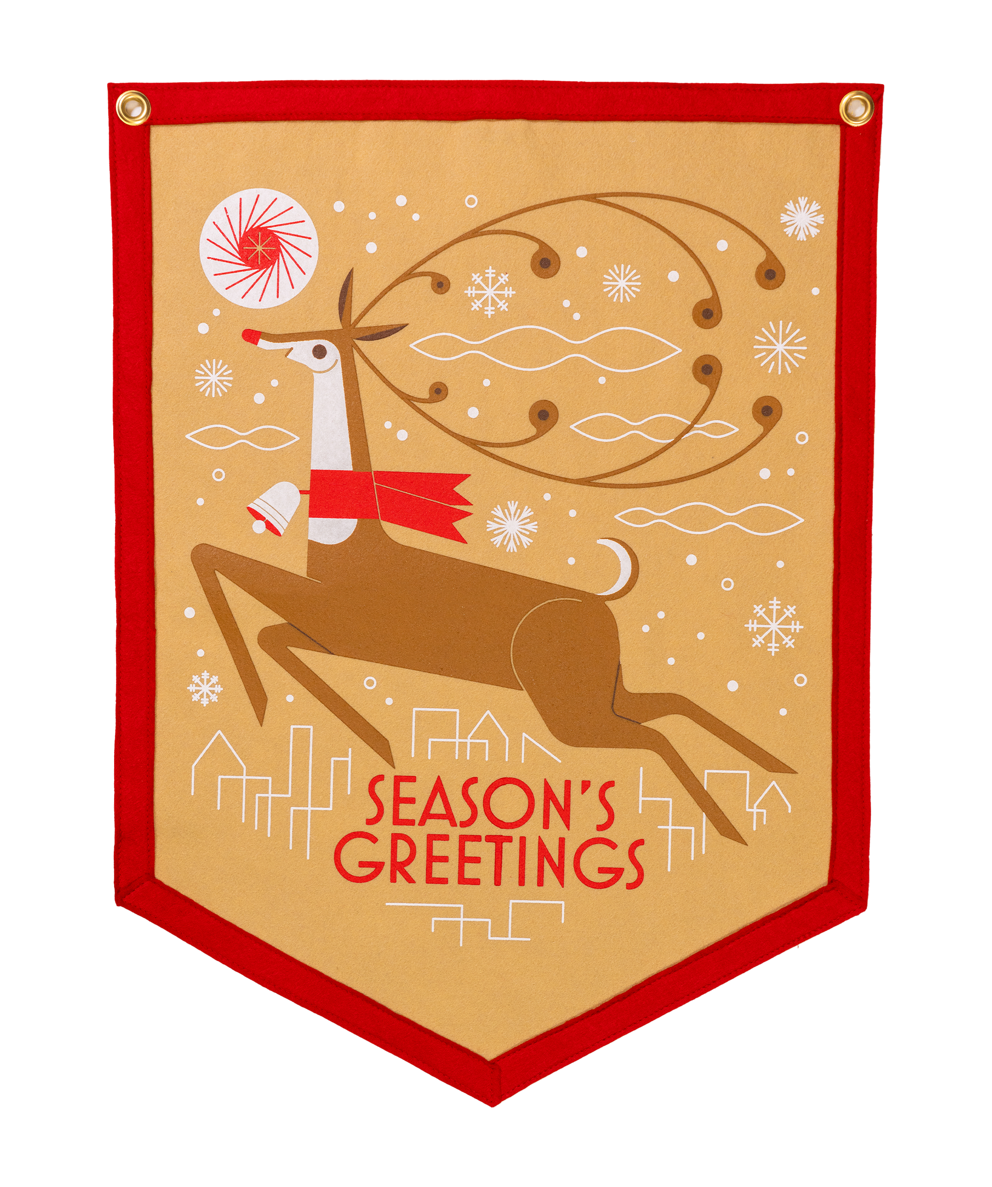 Add festive charm to your home and holiday party by hanging this Seasons Greetings camp flag, starring your favorite red nosed reindeer. Designed by our long time friends Invisible Creature. Size: 18" x 24" Color: Tan body with red, white, and brown details