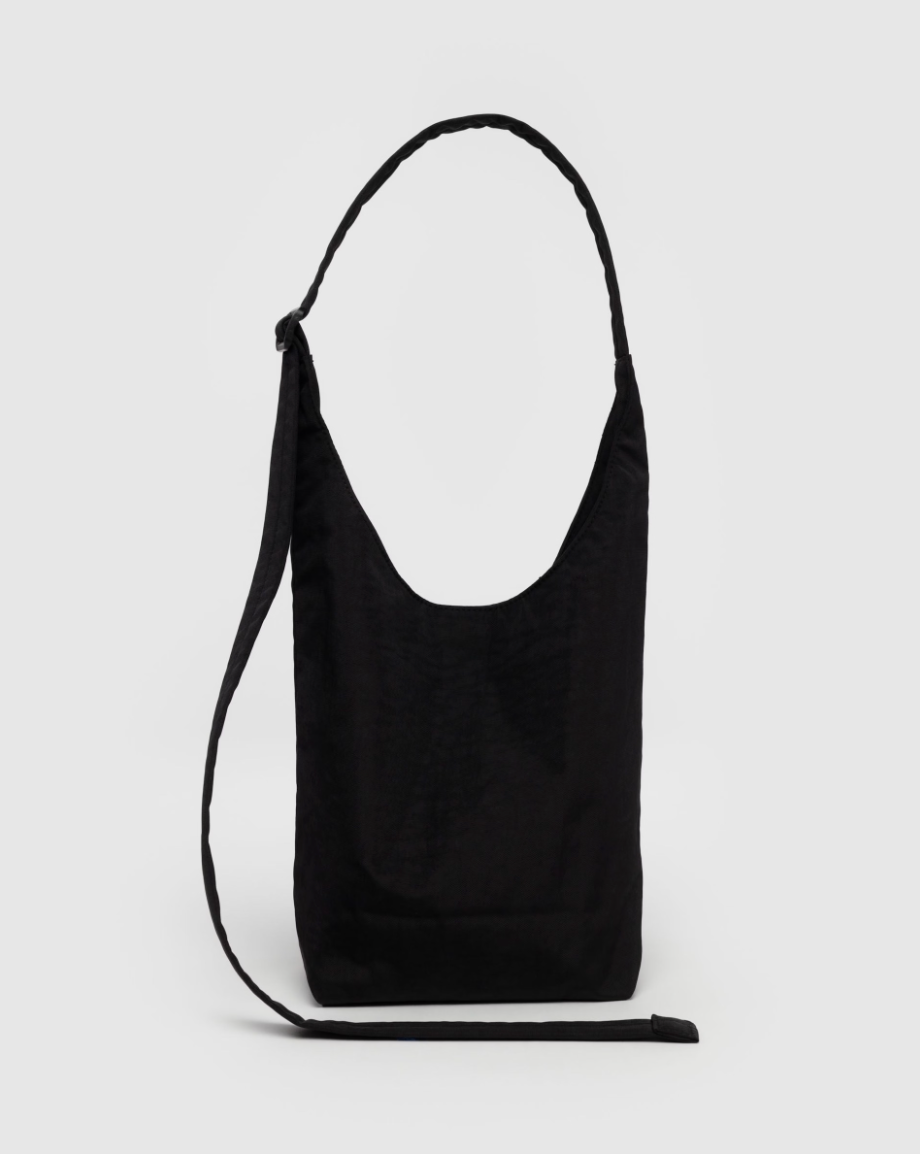 A slouchy, softly structured nylon bag with an adjustable strap. Interior zip pocket with a magnetic closure.