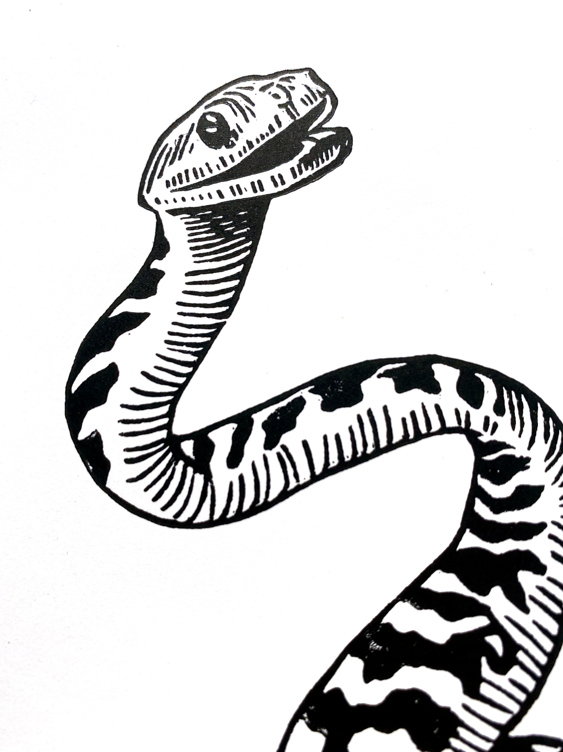 This is a 9x12", two-color linocut print of a snake in a cowboy boot!