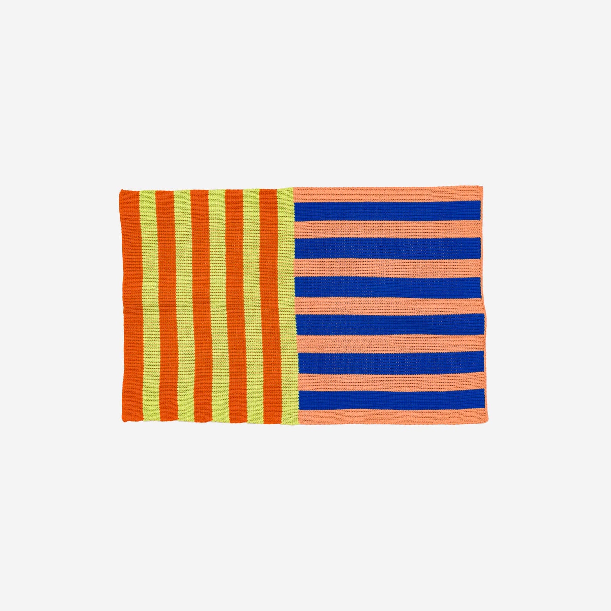 Sturdy colorblock stripe mini rug for kitchen, bathroom, entryway, and more. Non-slip rug pad included. Knit with new and repurposed deadstock yarn.