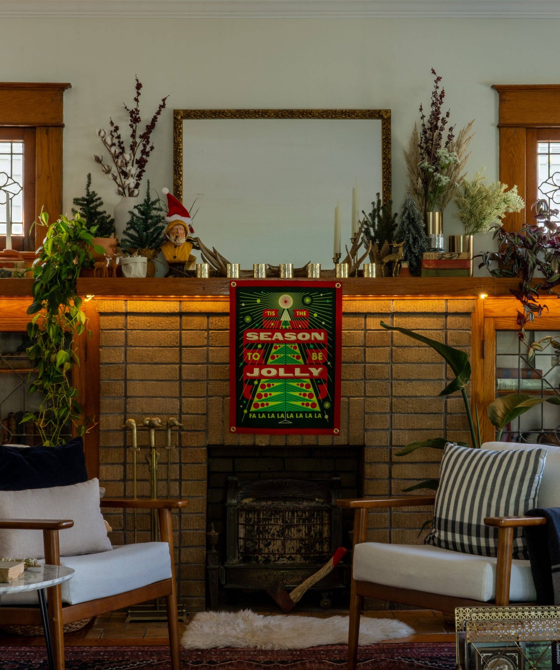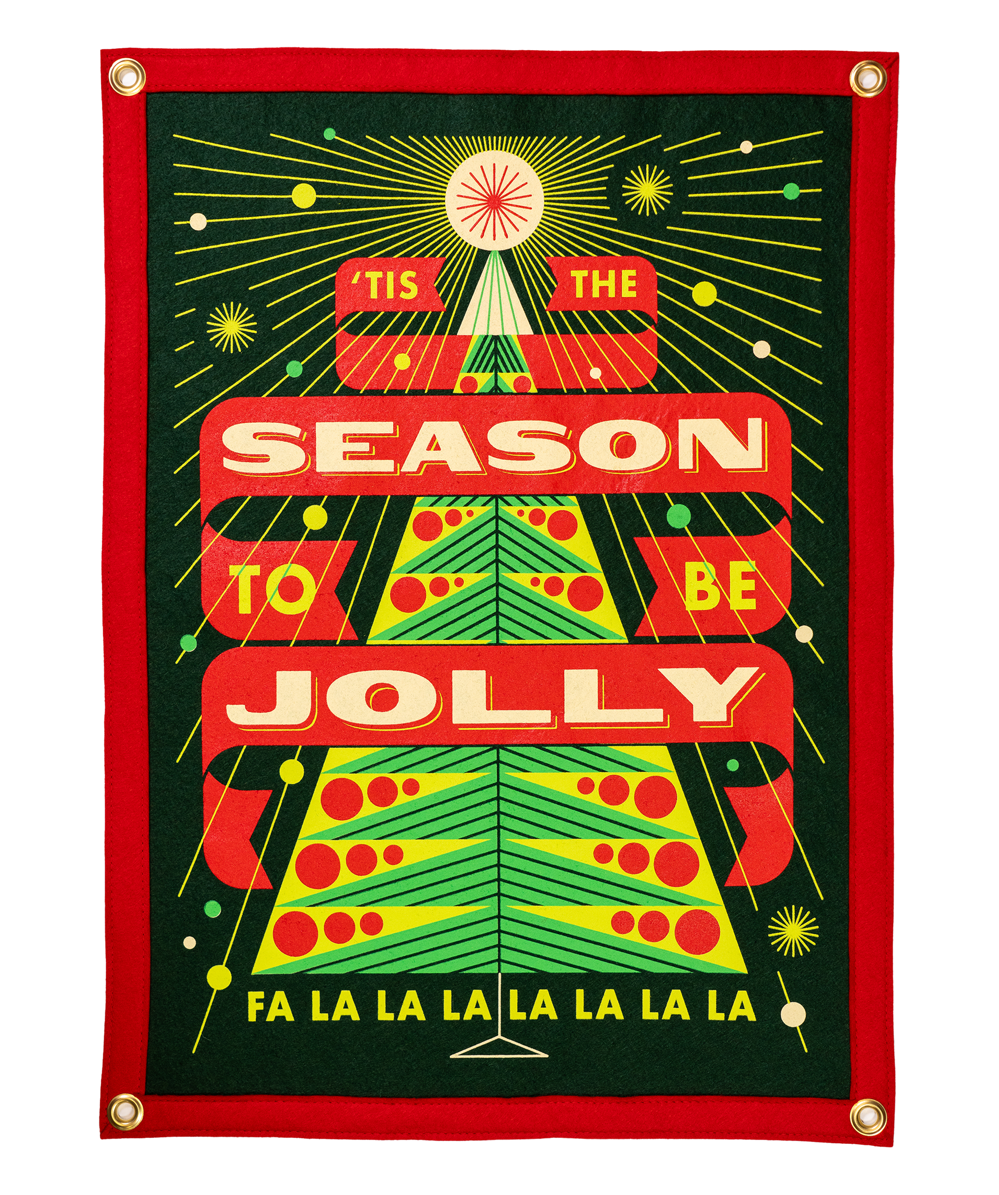 Add an extra touch of holiday cheer to your home this season by hanging this 'Tis The Season To Be Jolly camp flag by the chimney with care. Designed by our long time friends Invisible Creature. Size: 18" x 24" Color: Forest green body with red cream and green details